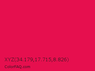 XYZ 34.179,17.715,8.826 Color is a normal rose color and the nearest color is Spanish Crimson #e51a4c. Hex code #e60f4e and RGB value is rgb(230,15,78). In RGB color space, this color is composed of 90% red, 6% green, 31% blue, In CMYK color space, this color is composed of 0% cyan, 93% magenta, 66% yellow , 10% black , In HSL color space, this color has a hue angle of 342° , 88% saturation and 48% lightness.