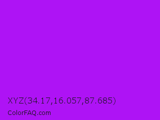 XYZ 34.17,16.057,87.685 Color is a normal purple color and the nearest color is Veronica #a020f0. Hex code #ae13f5 and RGB value is rgb(174,19,245). In RGB color space, this color is composed of 68% red, 7% green, 96% blue, In CMYK color space, this color is composed of 29% cyan, 92% magenta, 0% yellow , 4% black , In HSL color space, this color has a hue angle of 281° , 92% saturation and 52% lightness.