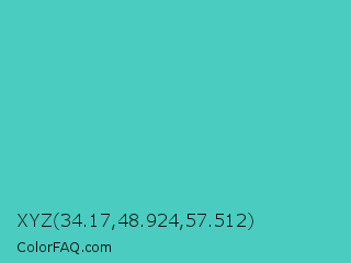 XYZ 34.17,48.924,57.512 Color is a normal cyan color and the nearest color is Medium Turquoise #48d1cc. Hex code #4acdc0 and RGB value is rgb(74,205,192). In RGB color space, this color is composed of 29% red, 80% green, 75% blue, In CMYK color space, this color is composed of 64% cyan, 0% magenta, 6% yellow , 20% black , In HSL color space, this color has a hue angle of 174° , 57% saturation and 55% lightness.