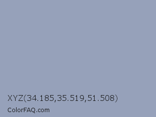XYZ 34.185,35.519,51.508 Color is a light blue color and the nearest color is Cadet Grey #91a3b0. Hex code #96a1ba and RGB value is rgb(150,161,186). In RGB color space, this color is composed of 59% red, 63% green, 73% blue, In CMYK color space, this color is composed of 19% cyan, 13% magenta, 0% yellow , 27% black , In HSL color space, this color has a hue angle of 222° , 21% saturation and 66% lightness.