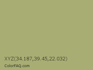 XYZ 34.187,39.45,22.032 Color is a normal yellow color and the nearest color is Green Smoke #a4af6e. Hex code #a8ad73 and RGB value is rgb(168,173,115). In RGB color space, this color is composed of 66% red, 68% green, 45% blue, In CMYK color space, this color is composed of 3% cyan, 0% magenta, 34% yellow , 32% black , In HSL color space, this color has a hue angle of 65° , 26% saturation and 56% lightness.