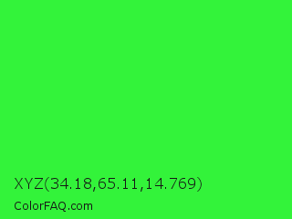 XYZ 34.18,65.11,14.769 Color is a normal green color and the nearest color is Lime Green #32cd32. Hex code #33f33a and RGB value is rgb(51,243,58). In RGB color space, this color is composed of 20% red, 95% green, 23% blue, In CMYK color space, this color is composed of 79% cyan, 0% magenta, 76% yellow , 5% black , In HSL color space, this color has a hue angle of 122° , 89% saturation and 58% lightness.