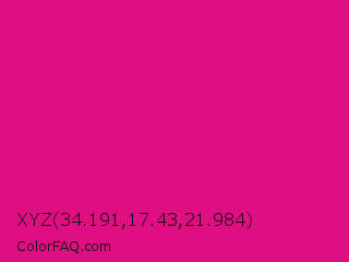 XYZ 34.191,17.43,21.984 Color is a normal magenta color and the nearest color is Vivid Cerise #da1d81. Hex code #de0f80 and RGB value is rgb(222,15,128). In RGB color space, this color is composed of 87% red, 6% green, 50% blue, In CMYK color space, this color is composed of 0% cyan, 93% magenta, 42% yellow , 13% black , In HSL color space, this color has a hue angle of 327° , 87% saturation and 46% lightness.