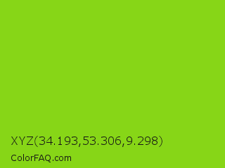 XYZ 34.193,53.306,9.298 Color is a normal green color and the nearest color is Alien Armpit #84de02. Hex code #87d617 and RGB value is rgb(135,214,23). In RGB color space, this color is composed of 53% red, 84% green, 9% blue, In CMYK color space, this color is composed of 37% cyan, 0% magenta, 89% yellow , 16% black , In HSL color space, this color has a hue angle of 85° , 81% saturation and 46% lightness.