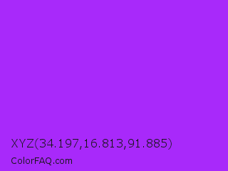 XYZ 34.197,16.813,91.885 Color is a normal purple color and the nearest color is Veronica #a020f0. Hex code #a829fa and RGB value is rgb(168,41,250). In RGB color space, this color is composed of 66% red, 16% green, 98% blue, In CMYK color space, this color is composed of 33% cyan, 84% magenta, 0% yellow , 2% black , In HSL color space, this color has a hue angle of 276° , 95% saturation and 57% lightness.
