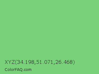 XYZ 34.198,51.071,26.468 Color is a light green color and the nearest color is Pastel Green #77dd77. Hex code #79d17a and RGB value is rgb(121,209,122). In RGB color space, this color is composed of 47% red, 82% green, 48% blue, In CMYK color space, this color is composed of 42% cyan, 0% magenta, 42% yellow , 18% black , In HSL color space, this color has a hue angle of 121° , 49% saturation and 65% lightness.