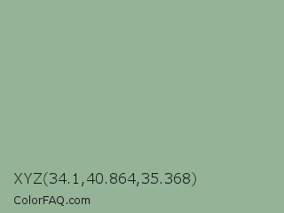 XYZ 34.1,40.864,35.368 Color is a light green color and the nearest color is Dark Sea Green #8fbc8f. Hex code #95b397 and RGB value is rgb(149,179,151). In RGB color space, this color is composed of 58% red, 70% green, 59% blue, In CMYK color space, this color is composed of 17% cyan, 0% magenta, 16% yellow , 30% black , In HSL color space, this color has a hue angle of 124° , 16% saturation and 64% lightness.