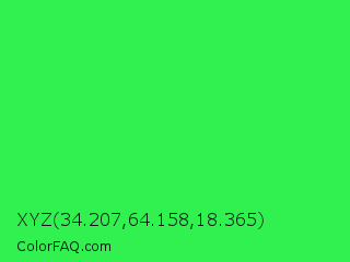 XYZ 34.207,64.158,18.365 Color is a normal green color and the nearest color is Malachite #0bda51. Hex code #31f151 and RGB value is rgb(49,241,81). In RGB color space, this color is composed of 19% red, 95% green, 32% blue, In CMYK color space, this color is composed of 80% cyan, 0% magenta, 66% yellow , 5% black , In HSL color space, this color has a hue angle of 130° , 87% saturation and 57% lightness.