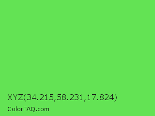 XYZ 34.215,58.231,17.824 Color is a light green color and the nearest color is Screamin Green #66ff66. Hex code #63e354 and RGB value is rgb(99,227,84). In RGB color space, this color is composed of 39% red, 89% green, 33% blue, In CMYK color space, this color is composed of 56% cyan, 0% magenta, 63% yellow , 11% black , In HSL color space, this color has a hue angle of 114° , 72% saturation and 61% lightness.