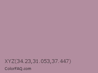 XYZ 34.23,31.053,37.447 Color is a light rose color and the nearest color is Opera Mauve #b784a7. Hex code #b28da0 and RGB value is rgb(178,141,160). In RGB color space, this color is composed of 70% red, 55% green, 63% blue, In CMYK color space, this color is composed of 0% cyan, 21% magenta, 10% yellow , 30% black , In HSL color space, this color has a hue angle of 329° , 19% saturation and 63% lightness.