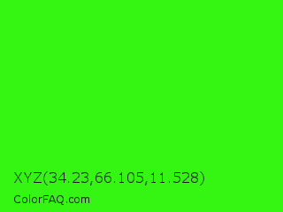 XYZ 34.23,66.105,11.528 Color is a normal green color and the nearest color is Neon Green #39ff14. Hex code #35f512 and RGB value is rgb(53,245,18). In RGB color space, this color is composed of 21% red, 96% green, 7% blue, In CMYK color space, this color is composed of 78% cyan, 0% magenta, 93% yellow , 4% black , In HSL color space, this color has a hue angle of 111° , 92% saturation and 52% lightness.