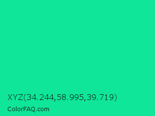 XYZ 34.244,58.995,39.719 Color is a normal green color and the nearest color is Medium Spring Green #00fa9a. Hex code #0fe699 and RGB value is rgb(15,230,153). In RGB color space, this color is composed of 6% red, 90% green, 60% blue, In CMYK color space, this color is composed of 93% cyan, 0% magenta, 33% yellow , 10% black , In HSL color space, this color has a hue angle of 159° , 88% saturation and 48% lightness.