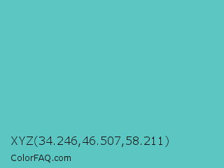 XYZ 34.246,46.507,58.211 Color is a normal cyan color and the nearest color is Fountain Blue #56b4be. Hex code #5bc6c2 and RGB value is rgb(91,198,194). In RGB color space, this color is composed of 36% red, 78% green, 76% blue, In CMYK color space, this color is composed of 54% cyan, 0% magenta, 2% yellow , 22% black , In HSL color space, this color has a hue angle of 178° , 48% saturation and 57% lightness.