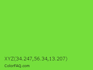 XYZ 34.247,56.34,13.207 Color is a normal green color and the nearest color is Kiwi #8ee53f. Hex code #75de3b and RGB value is rgb(117,222,59). In RGB color space, this color is composed of 46% red, 87% green, 23% blue, In CMYK color space, this color is composed of 47% cyan, 0% magenta, 73% yellow , 13% black , In HSL color space, this color has a hue angle of 99° , 71% saturation and 55% lightness.