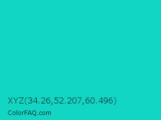 XYZ 34.26,52.207,60.496 Color is a normal cyan color and the nearest color is Robins Egg Blue #00cccc. Hex code #12d6c4 and RGB value is rgb(18,214,196). In RGB color space, this color is composed of 7% red, 84% green, 77% blue, In CMYK color space, this color is composed of 92% cyan, 0% magenta, 8% yellow , 16% black , In HSL color space, this color has a hue angle of 174° , 84% saturation and 45% lightness.