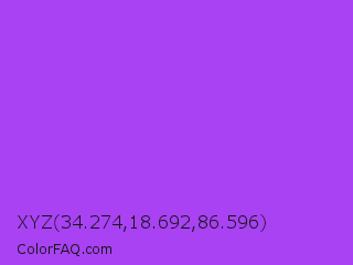 XYZ 34.274,18.692,86.596 Color is a light purple color and the nearest color is Navy Purple #9457eb. Hex code #a842f3 and RGB value is rgb(168,66,243). In RGB color space, this color is composed of 66% red, 26% green, 95% blue, In CMYK color space, this color is composed of 31% cyan, 73% magenta, 0% yellow , 5% black , In HSL color space, this color has a hue angle of 275° , 88% saturation and 61% lightness.