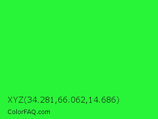 XYZ 34.281,66.062,14.686 Color is a normal green color and the nearest color is Neon Green #39ff14. Hex code #29f538 and RGB value is rgb(41,245,56). In RGB color space, this color is composed of 16% red, 96% green, 22% blue, In CMYK color space, this color is composed of 83% cyan, 0% magenta, 77% yellow , 4% black , In HSL color space, this color has a hue angle of 124° , 91% saturation and 56% lightness.