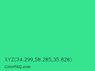 XYZ 34.299,58.285,35.828 Color is a normal green color and the nearest color is Shamrock #33cc99. Hex code #36e490 and RGB value is rgb(54,228,144). In RGB color space, this color is composed of 21% red, 89% green, 56% blue, In CMYK color space, this color is composed of 76% cyan, 0% magenta, 37% yellow , 11% black , In HSL color space, this color has a hue angle of 151° , 76% saturation and 55% lightness.