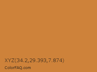 XYZ 34.2,29.393,7.874 Color is a normal orange color and the nearest color is Peru #cd853f. Hex code #ce823a and RGB value is rgb(206,130,58). In RGB color space, this color is composed of 81% red, 51% green, 23% blue, In CMYK color space, this color is composed of 0% cyan, 37% magenta, 72% yellow , 19% black , In HSL color space, this color has a hue angle of 29° , 60% saturation and 52% lightness.