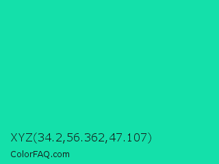 XYZ 34.2,56.362,47.107 Color is a normal cyan color and the nearest color is Caribbean Green #00cc99. Hex code #14e0aa and RGB value is rgb(20,224,170). In RGB color space, this color is composed of 8% red, 88% green, 67% blue, In CMYK color space, this color is composed of 91% cyan, 0% magenta, 24% yellow , 12% black , In HSL color space, this color has a hue angle of 164° , 84% saturation and 48% lightness.