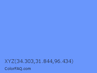 XYZ 34.303,31.844,96.434 Color is a light blue color and the nearest color is Cornflower Blue #6495ed. Hex code #6996fc and RGB value is rgb(105,150,252). In RGB color space, this color is composed of 41% red, 59% green, 99% blue, In CMYK color space, this color is composed of 58% cyan, 40% magenta, 0% yellow , 1% black , In HSL color space, this color has a hue angle of 222° , 96% saturation and 70% lightness.