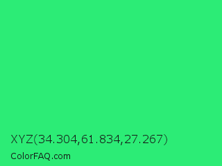 XYZ 34.304,61.834,27.267 Color is a normal green color and the nearest color is UFO Green #3cd070. Hex code #2cec76 and RGB value is rgb(44,236,118). In RGB color space, this color is composed of 17% red, 93% green, 46% blue, In CMYK color space, this color is composed of 81% cyan, 0% magenta, 50% yellow , 7% black , In HSL color space, this color has a hue angle of 143° , 83% saturation and 55% lightness.