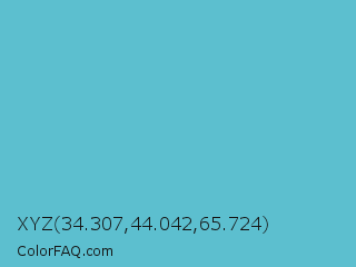 XYZ 34.307,44.042,65.724 Color is a normal cyan color and the nearest color is Sea Serpent #4bc7cf. Hex code #5cbfcf and RGB value is rgb(92,191,207). In RGB color space, this color is composed of 36% red, 75% green, 81% blue, In CMYK color space, this color is composed of 56% cyan, 8% magenta, 0% yellow , 19% black , In HSL color space, this color has a hue angle of 188° , 55% saturation and 59% lightness.