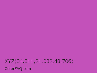 XYZ 34.311,21.032,48.706 Color is a normal magenta color and the nearest color is Fuchsia Pink #c154c1. Hex code #c351ba and RGB value is rgb(195,81,186). In RGB color space, this color is composed of 76% red, 32% green, 73% blue, In CMYK color space, this color is composed of 0% cyan, 58% magenta, 5% yellow , 24% black , In HSL color space, this color has a hue angle of 305° , 49% saturation and 54% lightness.