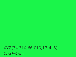 XYZ 34.314,66.019,17.413 Color is a normal green color and the nearest color is Malachite #0bda51. Hex code #1af54a and RGB value is rgb(26,245,74). In RGB color space, this color is composed of 10% red, 96% green, 29% blue, In CMYK color space, this color is composed of 89% cyan, 0% magenta, 70% yellow , 4% black , In HSL color space, this color has a hue angle of 133° , 92% saturation and 53% lightness.