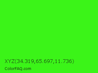 XYZ 34.319,65.697,11.736 Color is a normal green color and the nearest color is Neon Green #39ff14. Hex code #3bf418 and RGB value is rgb(59,244,24). In RGB color space, this color is composed of 23% red, 96% green, 9% blue, In CMYK color space, this color is composed of 76% cyan, 0% magenta, 90% yellow , 4% black , In HSL color space, this color has a hue angle of 110° , 91% saturation and 53% lightness.