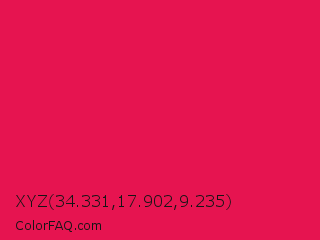 XYZ 34.331,17.902,9.235 Color is a normal rose color and the nearest color is Spanish Crimson #e51a4c. Hex code #e61450 and RGB value is rgb(230,20,80). In RGB color space, this color is composed of 90% red, 8% green, 31% blue, In CMYK color space, this color is composed of 0% cyan, 91% magenta, 65% yellow , 10% black , In HSL color space, this color has a hue angle of 343° , 84% saturation and 49% lightness.