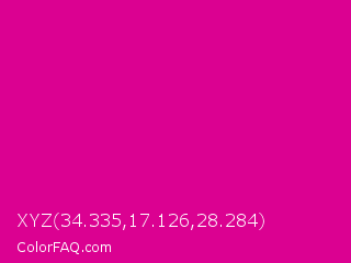 XYZ 34.335,17.126,28.284 Color is a normal magenta color and the nearest color is Mexican Pink #e4007c. Hex code #db0191 and RGB value is rgb(219,1,145). In RGB color space, this color is composed of 86% red, 0% green, 57% blue, In CMYK color space, this color is composed of 0% cyan, 100% magenta, 34% yellow , 14% black , In HSL color space, this color has a hue angle of 320° , 99% saturation and 43% lightness.