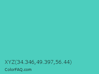 XYZ 34.346,49.397,56.44 Color is a normal cyan color and the nearest color is Medium Turquoise #48d1cc. Hex code #4ccebe and RGB value is rgb(76,206,190). In RGB color space, this color is composed of 30% red, 81% green, 75% blue, In CMYK color space, this color is composed of 63% cyan, 0% magenta, 8% yellow , 19% black , In HSL color space, this color has a hue angle of 173° , 57% saturation and 55% lightness.