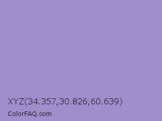 XYZ 34.357,30.826,60.639 Color is a light indigo color and the nearest color is Blue Bell Crayola #9999cc. Hex code #9d8ecb and RGB value is rgb(157,142,203). In RGB color space, this color is composed of 62% red, 56% green, 80% blue, In CMYK color space, this color is composed of 23% cyan, 30% magenta, 0% yellow , 20% black , In HSL color space, this color has a hue angle of 255° , 37% saturation and 68% lightness.