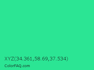 XYZ 34.361,58.69,37.534 Color is a normal green color and the nearest color is Shamrock #33cc99. Hex code #2be594 and RGB value is rgb(43,229,148). In RGB color space, this color is composed of 17% red, 90% green, 58% blue, In CMYK color space, this color is composed of 81% cyan, 0% magenta, 35% yellow , 10% black , In HSL color space, this color has a hue angle of 154° , 78% saturation and 53% lightness.