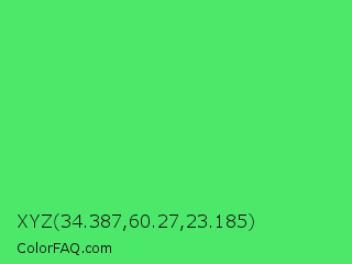 XYZ 34.387,60.27,23.185 Color is a normal green color and the nearest color is UFO Green #3cd070. Hex code #4ce869 and RGB value is rgb(76,232,105). In RGB color space, this color is composed of 30% red, 91% green, 41% blue, In CMYK color space, this color is composed of 67% cyan, 0% magenta, 55% yellow , 9% black , In HSL color space, this color has a hue angle of 131° , 77% saturation and 60% lightness.