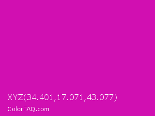 XYZ 34.401,17.071,43.077 Color is a normal magenta color and the nearest color is Deep Magenta #cc00cc. Hex code #d10fb1 and RGB value is rgb(209,15,177). In RGB color space, this color is composed of 82% red, 6% green, 69% blue, In CMYK color space, this color is composed of 0% cyan, 93% magenta, 15% yellow , 18% black , In HSL color space, this color has a hue angle of 310° , 87% saturation and 44% lightness.