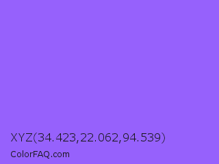 XYZ 34.423,22.062,94.539 Color is a light violet color and the nearest color is Navy Purple #9457eb. Hex code #9661fc and RGB value is rgb(150,97,252). In RGB color space, this color is composed of 59% red, 38% green, 99% blue, In CMYK color space, this color is composed of 40% cyan, 62% magenta, 0% yellow , 1% black , In HSL color space, this color has a hue angle of 261° , 96% saturation and 68% lightness.