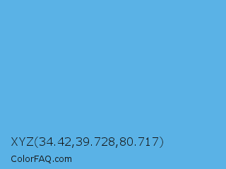 XYZ 34.42,39.728,80.717 Color is a light blue color and the nearest color is Blue Jeans #5dadec. Hex code #5ab2e6 and RGB value is rgb(90,178,230). In RGB color space, this color is composed of 35% red, 70% green, 90% blue, In CMYK color space, this color is composed of 61% cyan, 23% magenta, 0% yellow , 10% black , In HSL color space, this color has a hue angle of 202° , 74% saturation and 63% lightness.