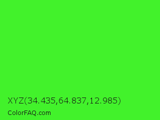 XYZ 34.435,64.837,12.985 Color is a normal green color and the nearest color is Neon Green #39ff14. Hex code #42f22b and RGB value is rgb(66,242,43). In RGB color space, this color is composed of 26% red, 95% green, 17% blue, In CMYK color space, this color is composed of 73% cyan, 0% magenta, 82% yellow , 5% black , In HSL color space, this color has a hue angle of 113° , 88% saturation and 56% lightness.
