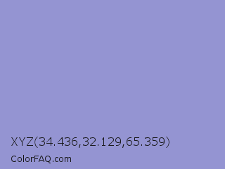 XYZ 34.436,32.129,65.359 Color is a light blue color and the nearest color is Blue Bell Crayola #9999cc. Hex code #9494d2 and RGB value is rgb(148,148,210). In RGB color space, this color is composed of 58% red, 58% green, 82% blue, In CMYK color space, this color is composed of 30% cyan, 30% magenta, 0% yellow , 18% black , In HSL color space, this color has a hue angle of 240° , 41% saturation and 70% lightness.