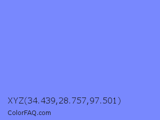 XYZ 34.439,28.757,97.501 Color is a light blue color and the nearest color is Cornflower Blue #6495ed. Hex code #7888fe and RGB value is rgb(120,136,254). In RGB color space, this color is composed of 47% red, 53% green, 100% blue, In CMYK color space, this color is composed of 53% cyan, 46% magenta, 0% yellow , 0% black , In HSL color space, this color has a hue angle of 233° , 99% saturation and 73% lightness.