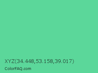 XYZ 34.448,53.158,39.017 Color is a normal green color and the nearest color is Medium Aquamarine #66ddaa. Hex code #5bd79a and RGB value is rgb(91,215,154). In RGB color space, this color is composed of 36% red, 84% green, 60% blue, In CMYK color space, this color is composed of 58% cyan, 0% magenta, 28% yellow , 16% black , In HSL color space, this color has a hue angle of 150° , 61% saturation and 60% lightness.