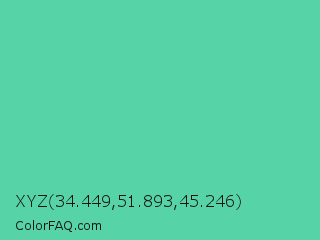 XYZ 34.449,51.893,45.246 Color is a normal green color and the nearest color is Eucalyptus #44d7a8. Hex code #56d4a8 and RGB value is rgb(86,212,168). In RGB color space, this color is composed of 34% red, 83% green, 66% blue, In CMYK color space, this color is composed of 59% cyan, 0% magenta, 21% yellow , 17% black , In HSL color space, this color has a hue angle of 159° , 59% saturation and 58% lightness.