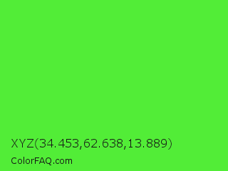 XYZ 34.453,62.638,13.889 Color is a normal green color and the nearest color is Lime Green #32cd32. Hex code #52ed37 and RGB value is rgb(82,237,55). In RGB color space, this color is composed of 32% red, 93% green, 22% blue, In CMYK color space, this color is composed of 65% cyan, 0% magenta, 77% yellow , 7% black , In HSL color space, this color has a hue angle of 111° , 83% saturation and 57% lightness.