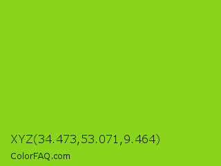 XYZ 34.473,53.071,9.464 Color is a normal green color and the nearest color is Atlantis #97cd2d. Hex code #8ad51b and RGB value is rgb(138,213,27). In RGB color space, this color is composed of 54% red, 84% green, 11% blue, In CMYK color space, this color is composed of 35% cyan, 0% magenta, 87% yellow , 16% black , In HSL color space, this color has a hue angle of 84° , 78% saturation and 47% lightness.