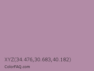 XYZ 34.476,30.683,40.182 Color is a light magenta color and the nearest color is Opera Mauve #b784a7. Hex code #b28ba6 and RGB value is rgb(178,139,166). In RGB color space, this color is composed of 70% red, 55% green, 65% blue, In CMYK color space, this color is composed of 0% cyan, 22% magenta, 7% yellow , 30% black , In HSL color space, this color has a hue angle of 318° , 20% saturation and 62% lightness.