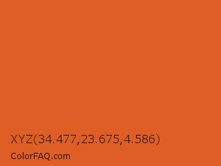 XYZ 34.477,23.675,4.586 Color is a normal orange color and the nearest color is Vivid Red Tangelo #df6124. Hex code #de5e26 and RGB value is rgb(222,94,38). In RGB color space, this color is composed of 87% red, 37% green, 15% blue, In CMYK color space, this color is composed of 0% cyan, 58% magenta, 83% yellow , 13% black , In HSL color space, this color has a hue angle of 18° , 74% saturation and 51% lightness.