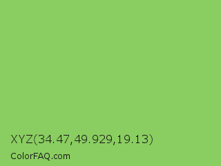 XYZ 34.47,49.929,19.13 Color is a normal green color and the nearest color is Dollar Bill #85bb65. Hex code #8acd61 and RGB value is rgb(138,205,97). In RGB color space, this color is composed of 54% red, 80% green, 38% blue, In CMYK color space, this color is composed of 33% cyan, 0% magenta, 53% yellow , 20% black , In HSL color space, this color has a hue angle of 97° , 52% saturation and 59% lightness.