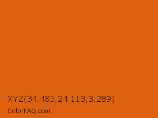 XYZ 34.485,24.113,3.289 Color is a normal orange color and the nearest color is Bamboo #da6304. Hex code #de610f and RGB value is rgb(222,97,15). In RGB color space, this color is composed of 87% red, 38% green, 6% blue, In CMYK color space, this color is composed of 0% cyan, 56% magenta, 93% yellow , 13% black , In HSL color space, this color has a hue angle of 24° , 87% saturation and 46% lightness.